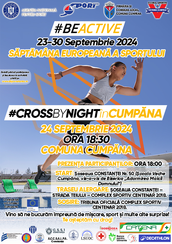 Comuna Cumpăna se alătură și în acest an sărbătorii sportului. Astfel, marți, 24 septembrie 2024, începând cu ora 18:00, Primăria și Consiliul Local Cumpăna, împreună cu Clubul Sportiv „Victoria” Cumpăna și instituțiile sportive partenere, organizează Cross-ul Cumpenei #BeActive.