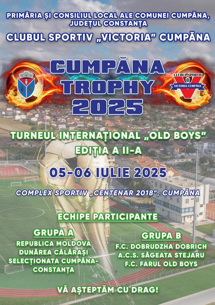 Clubul Sportiv „Victoria Cumpăna”, în parteneriat cu Primăria și Consiliul Local ale comunei Cumpăna, organizează weekendul acesta, 5–6 iulie 2025, cea de-a doua ediție a turneului internațional de fotbal “Old Boys” – „Cumpăna Trophy”.